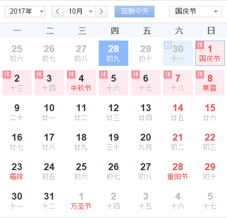 放假時間:10月1日-8日共8天:(注:9月30日全體人員正常上班。)